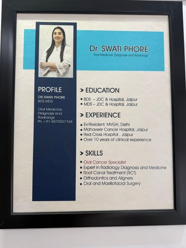 Dr. Swati Phore is an experienced oral medicine specialist, radiologist, and oral cancer expert. With her advanced training, she focuses on early detection, diagnosis, and management of oral diseases and cancers, along with preventive dental care.