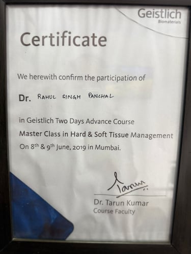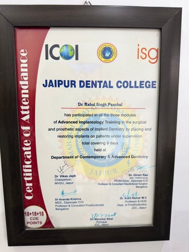 Dr. Rahul Singh is a specialist in maxillofacial prosthodontics, dental implants, and full-mouth rehabilitation. He has completed advanced implant training in both surgical and prosthetic aspects of implant dentistry, making him highly skilled in handling simple to complex implant cases, including single-tooth implants, hybrid dentures, and complete arch restorations.
